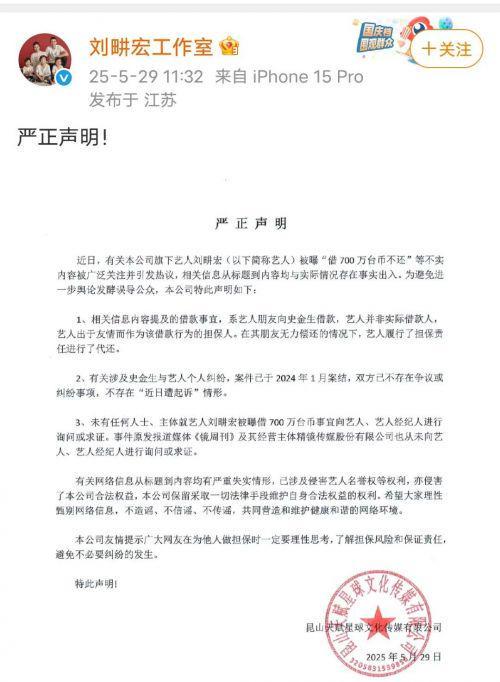 5月29日,刘畊宏工作室发表声明称,近日,有关本公司旗下艺人刘畊宏(以下简称“艺人”)被曝“借700万台币不还”等不实内容被广泛关注并引发热议,相关信息从标题到内容均与实际情况存在事实出入。声明称借款系艺人朋友向史金生借款,艺人并非实际借款人,艺人出于友情而作为该借款行为的担保人。在其朋友无力偿还的情况下,艺人履行了担保责任进行了代还;有关涉及史金生与艺人个人纠纷,案件已于2024年1月结案,双方已不存在争议或纠纷事项;未有任何人士、主体就艺人刘畊宏被曝借700万台币事宜向艺人、艺人经纪人进行询问或求证。